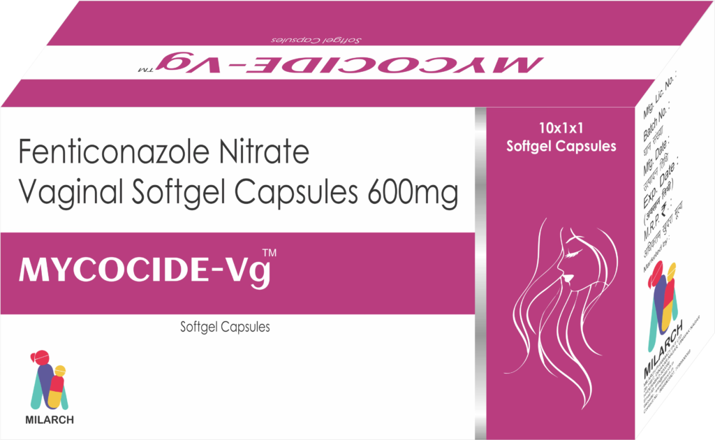 Mycocide-Vg™ vaginal softgel capsules with Fenticonazole Nitrate effectively treat Vulvo-vaginal candidiasis, mixed vaginitis, and Trichomoniasis. It prevents the growth of bacteria, protozoa, and fungi by inhibiting key enzymes and disrupting fungal cell membranes, ensuring rapid relief and recovery.